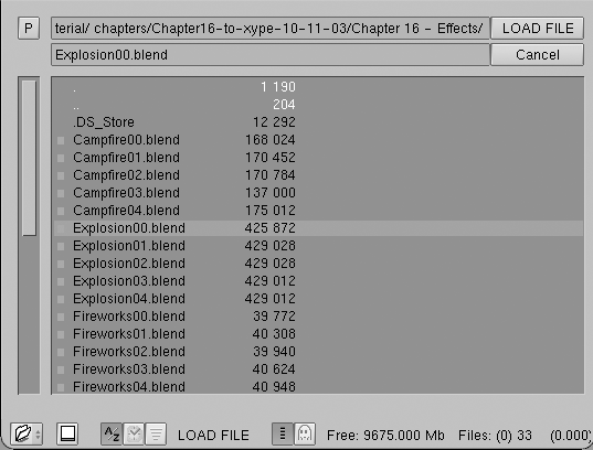 To load a Blender file from disk, press F1. The focused window then temporarily transforms into the File Selection Window as shown in Figure 3.18, “File Selection Window - loading.”. The bar on the left can be dragged with LMB for scrolling. To load a file, select it with LMB and press ENTER, or simply click it with MMB.