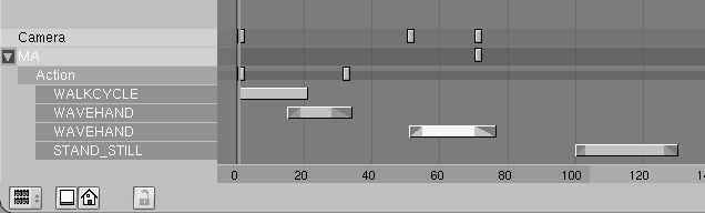 In the NLA Window Actions are displayed as a single strip below the object's strip; all of the KeyFrames of the Action (constraint channel KeyFrames included) are displayed on one line (Figure 16.14, “Expanded Action in NLA Window”). To see an expanded view of the Action, use the Action Window.