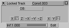 • Locked Track - This constraint causes the constraint owner to point one of its axes (by default the Y-axis) to point towards the target either in its positive or negative direction, depending on the selected Radio Buttons. The Object rotation will be computed so that another one of its axis (by default the Z-axis) direction is fixed, again this can be changed via the pertinent Radio Buttons.