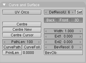 Play a bit with both to obtain a nice 'wing-like' profile and a fancy path (Figure 9.26, “Modified profile (left) and path (right).”). By default, Béziers exist only on a plane, and are 2D objects. To make the path span in all three directions of space, as in the example shown above, press the 3D button in the Curve EditButtons (F9) Curve and Surface panel (Figure 9.27, “3D Curve button.”).