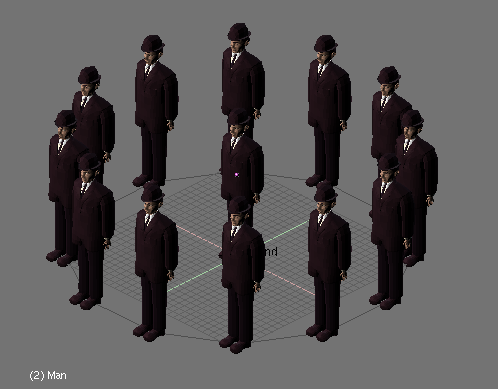 Select all vertices in Edit Mode and duplicate them (SHIFT-D). Now scale the new vertices outwards to get a second circle around the original. Leave Edit Mode, and a second circle of men will appear (Figure 22.7, “A second row of Magritte's men.”).